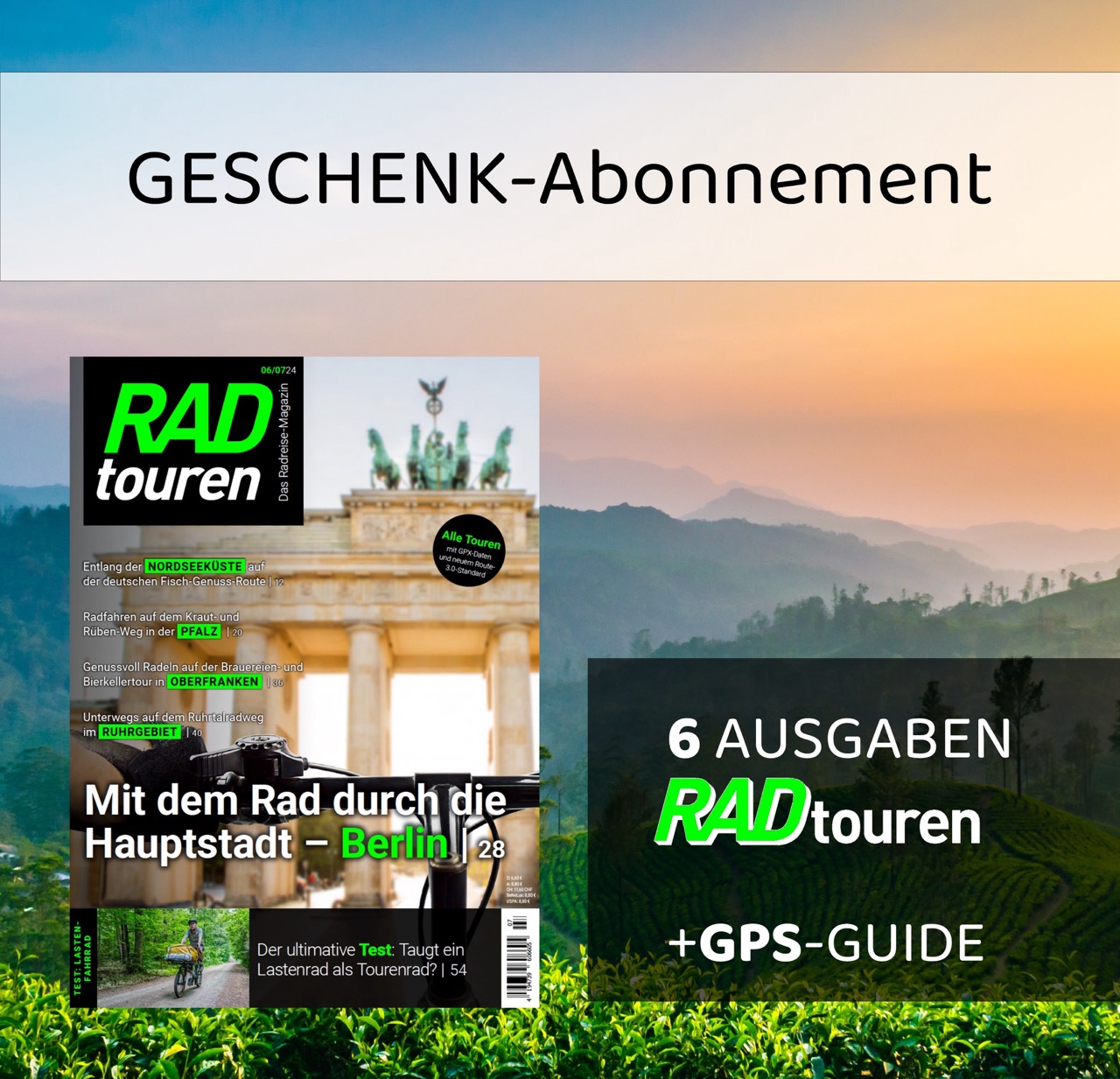 Ja, ich möchte ein RADtouren-Abo verschenken. Der Beschenkte erhält 6 RADtouren-Ausgaben und ein RADtouren-GPS-Guide pro Jahr geliefert. Ich bezahle 35,40 € inklusive Versandkosten*.